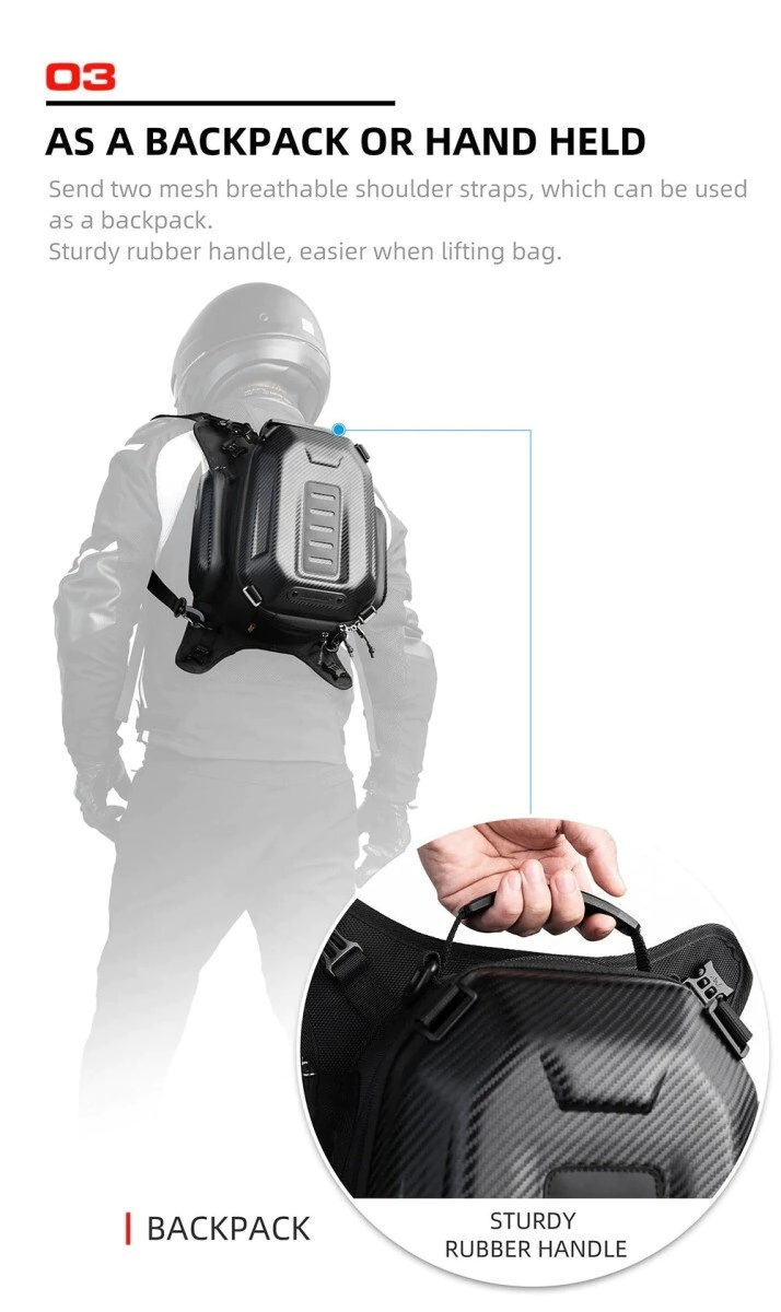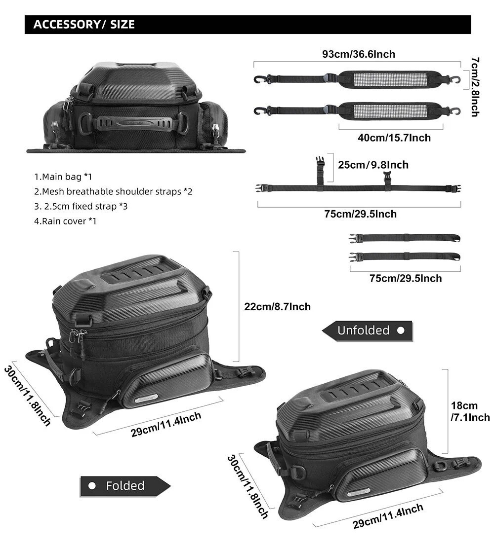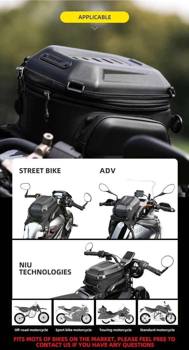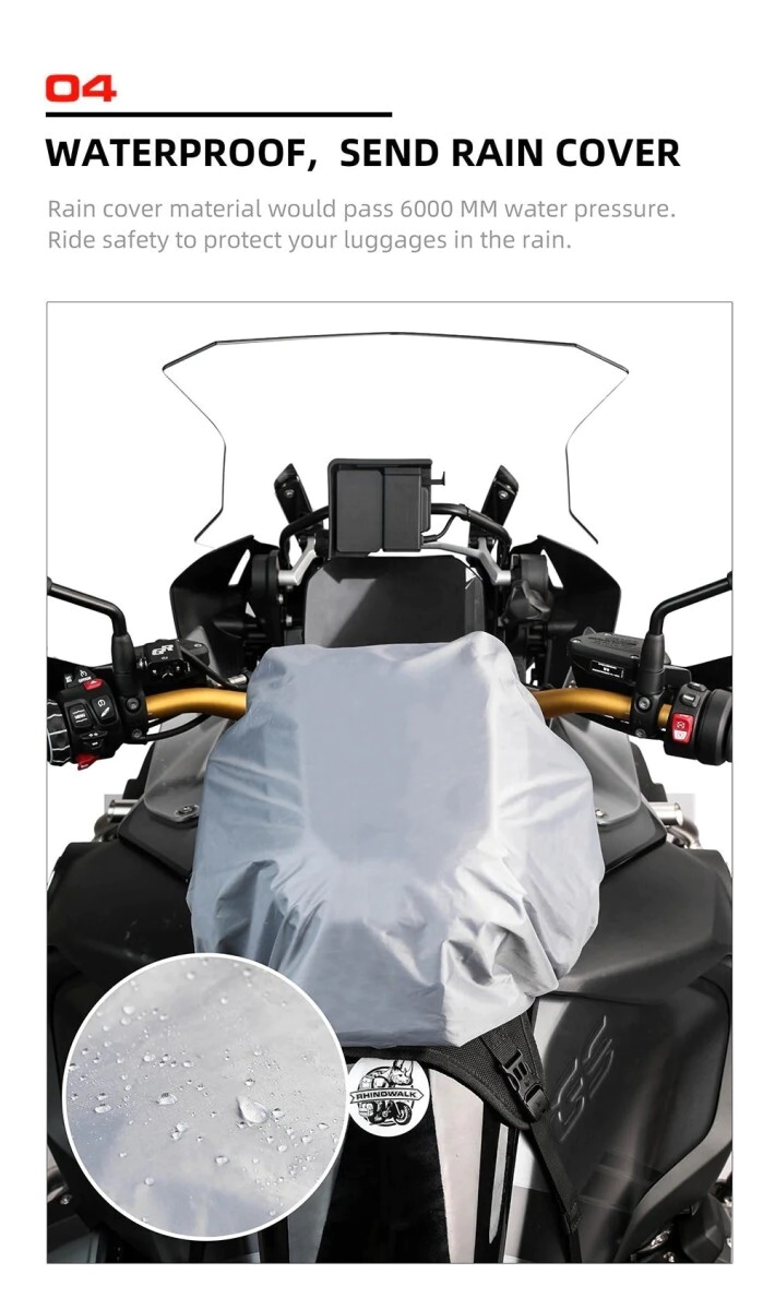 -Múltiples opciones de transporte y protección superior contra el clima: Equipada con dos correas de hombro de malla transpirable para una conversión sin esfuerzo en una mochila para motocicleta y un asa de goma personalizada para facilitar el levantamiento, además de una funda antilluvia integrada fabricada con poliéster de alta densidad, esta bolsa ofrece una excelente protección confiable de tanque para aplicaciones impermeables de motocicleta.