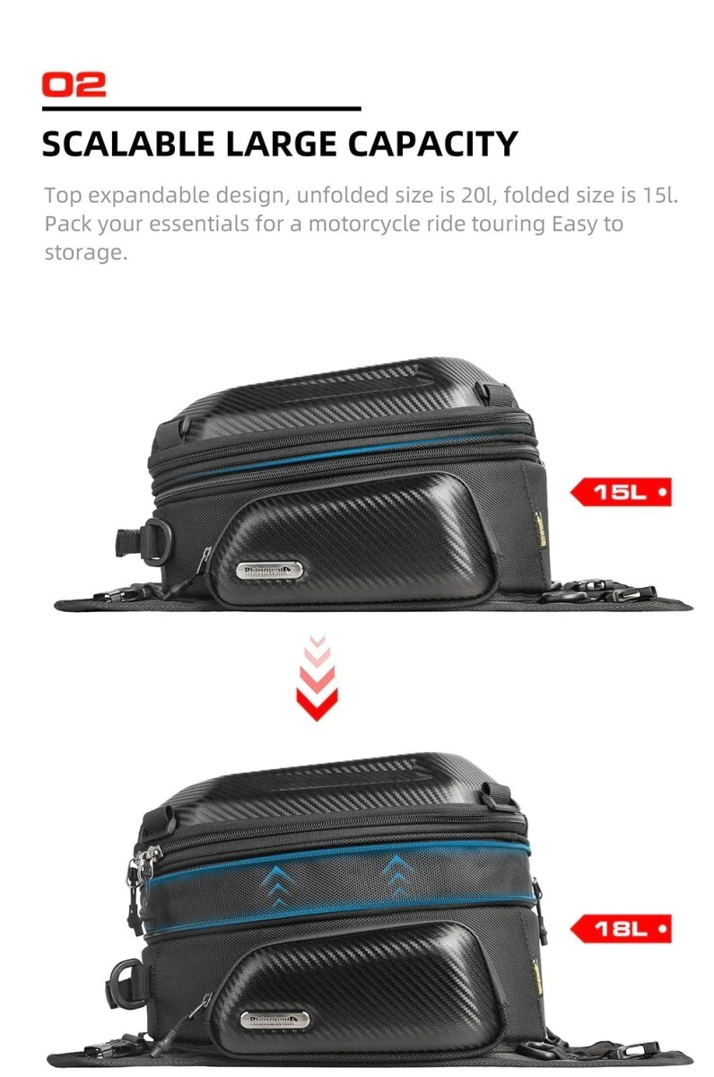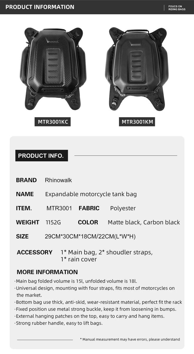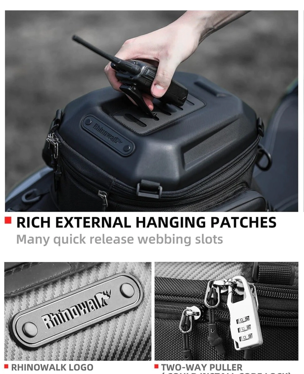 -Múltiples opciones de transporte y protección superior contra el clima: Equipada con dos correas de hombro de malla transpirable para una conversión sin esfuerzo en una mochila para motocicleta y un asa de goma personalizada para facilitar el levantamiento, además de una funda antilluvia integrada fabricada con poliéster de alta densidad, esta bolsa ofrece una excelente protección confiable de tanque para aplicaciones impermeables de motocicleta.