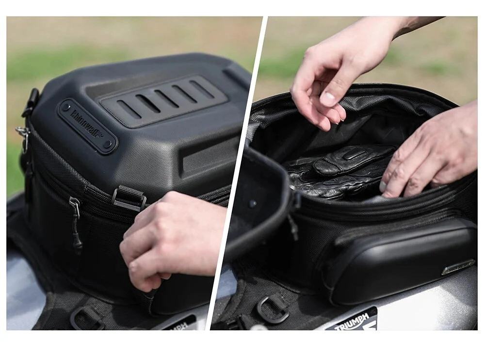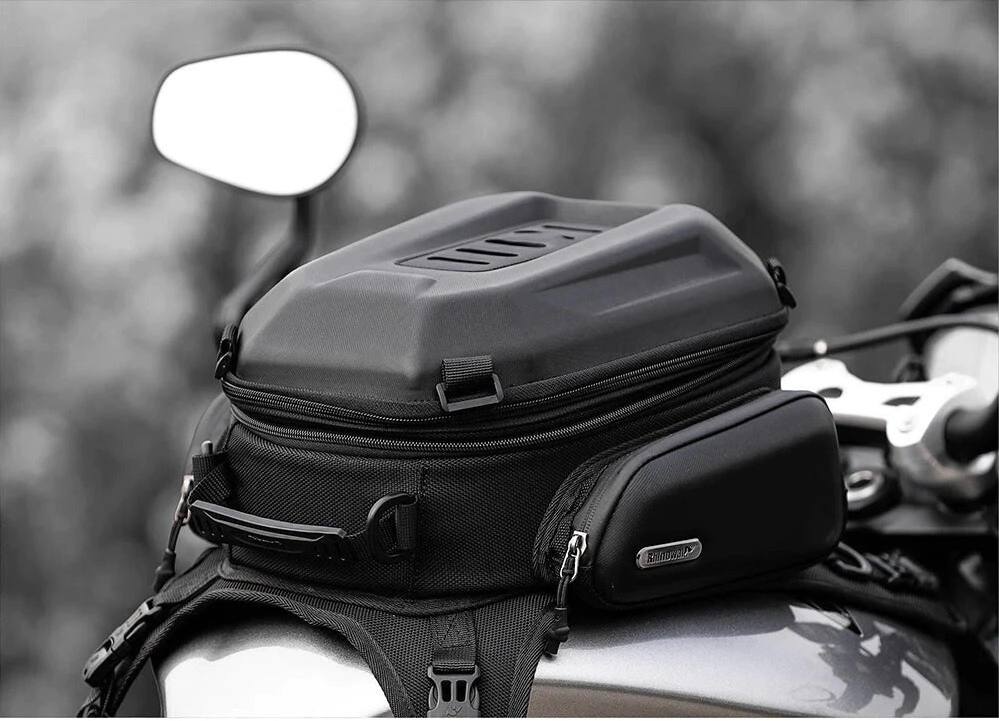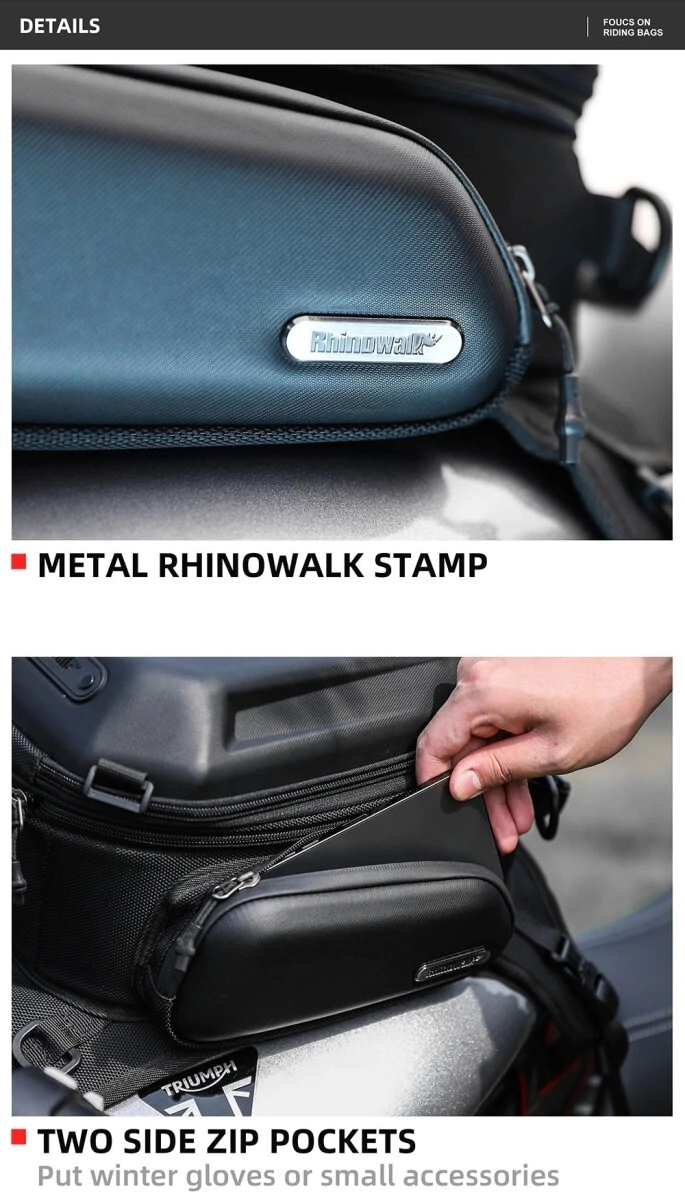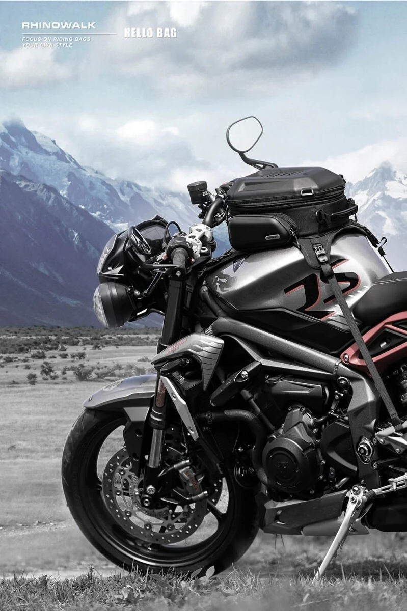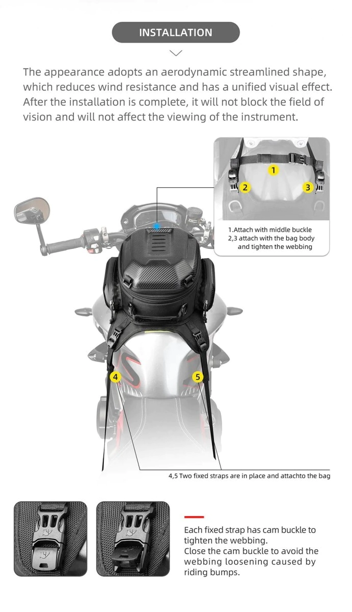 -Su sencillo sistema de correa de cuatro puntos garantiza un ajuste seguro en tu motocicleta, por lo que es una opción superior para una bolsa de tanque de motocicleta versátil.