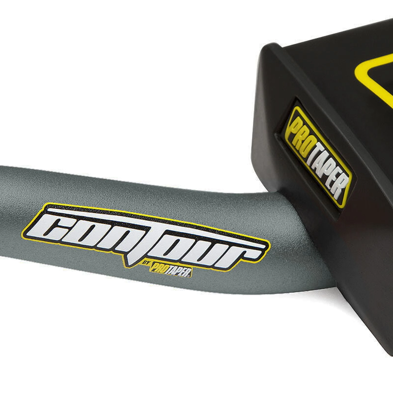 Pro Taper inventó y patentó los manubrios de diámetro sobredimensionado sin barra transversal. Este diseño único permite que el manubrio flexione y absorba mejor los impactos en comparación con los manubrios estándar de 7/8". La flexión intencional del manubrio mejora la comodidad del piloto y reduce la fatiga, mientras que el diámetro sobredimensionado en la zona de sujeción mantiene la integridad estructural. El manubrio Contour utiliza un diseño de pared de 5 mm perfilado por computadora, lo que lo hace un 20% más liviano y un 40% más resistente que la mayoría de los manubrios.