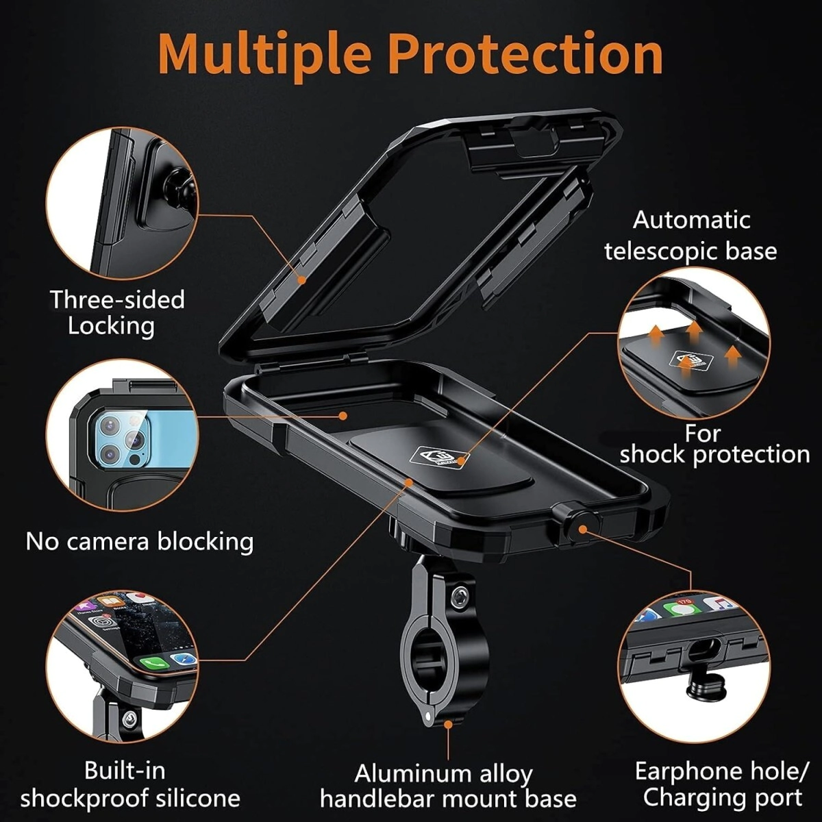 -Seguro y estable: el panel inferior está cubierto con silicona a prueba de golpes y equipado con una base resistente para evitar que tu teléfono se agite y raye, el diseño de bloqueo garantiza que tu teléfono esté fijado de forma segura en el soporte del teléfono celular de la motocicleta incluso en una calle llena de pozos