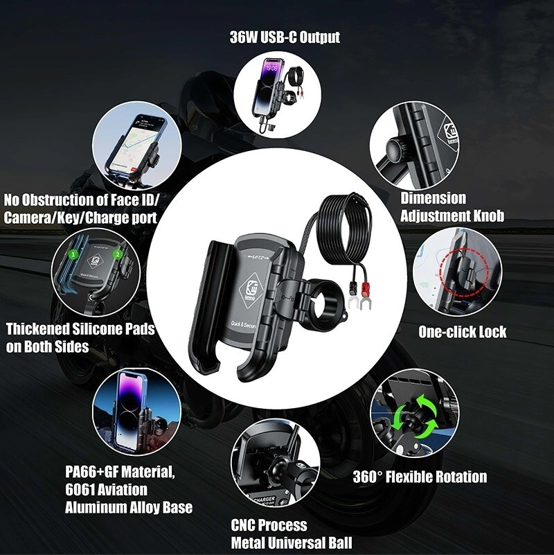-Rotación de 360° y resistente: está equipado con bola giratoria de 360 grados, puede ajustar su teléfono celular al paisaje, vertical o cualquier ángulo de visión que desee durante la conducción, el clip incorporado con almohadilla de goma de silicona suave alrededor de la abrazadera del teléfono para proteger su teléfono de arañazos y deslizamientos, le permite disfrutar de la diversión de montar sin preocupaciones.