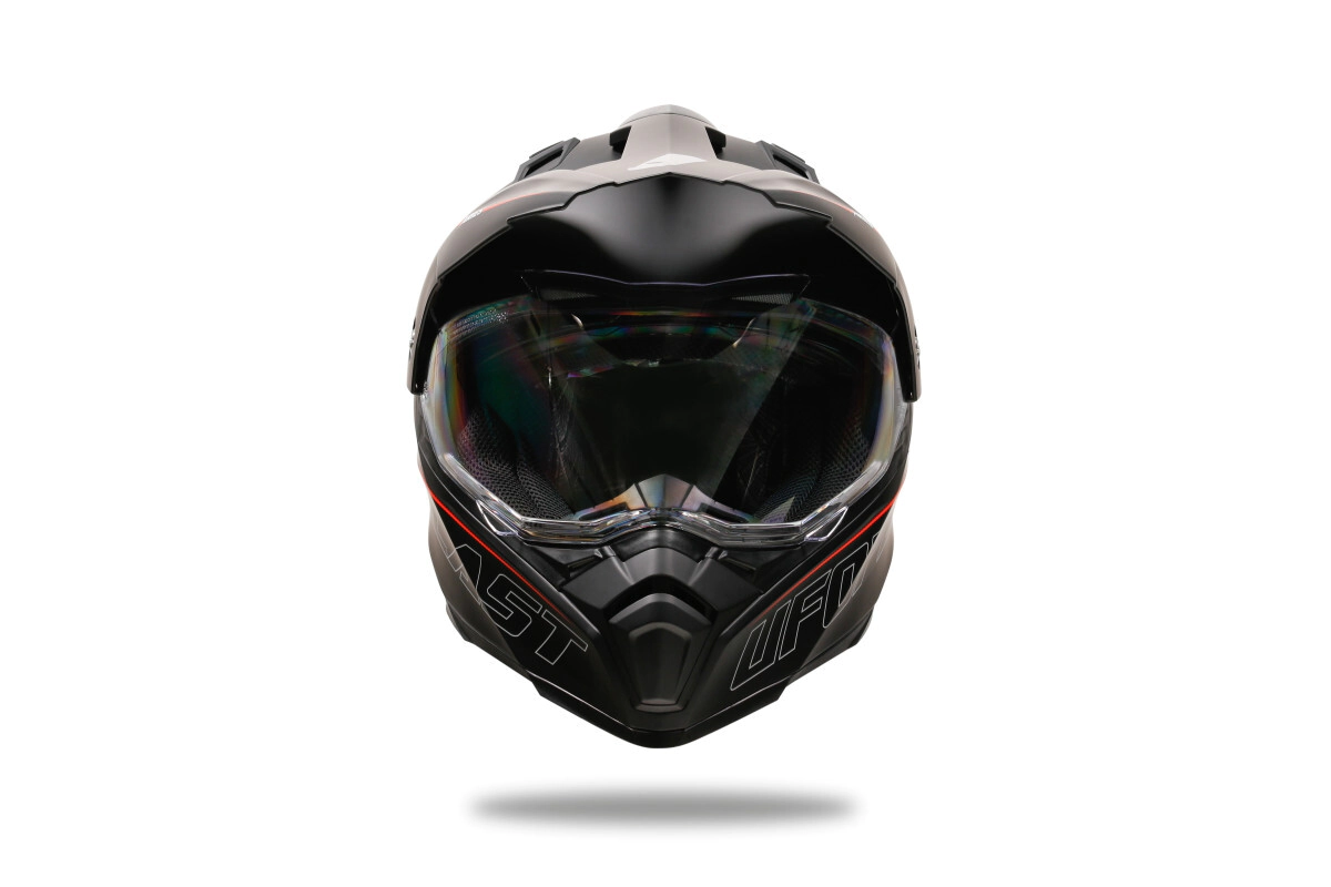 La gran visera de policarbonato transparente resistente a los arañazos, combinada con la segunda visera interna ahumada anti-UV y la visera derivada del casco MX (desmontable para uso en carretera) garantizan una excelente visibilidad en cualquier condición.