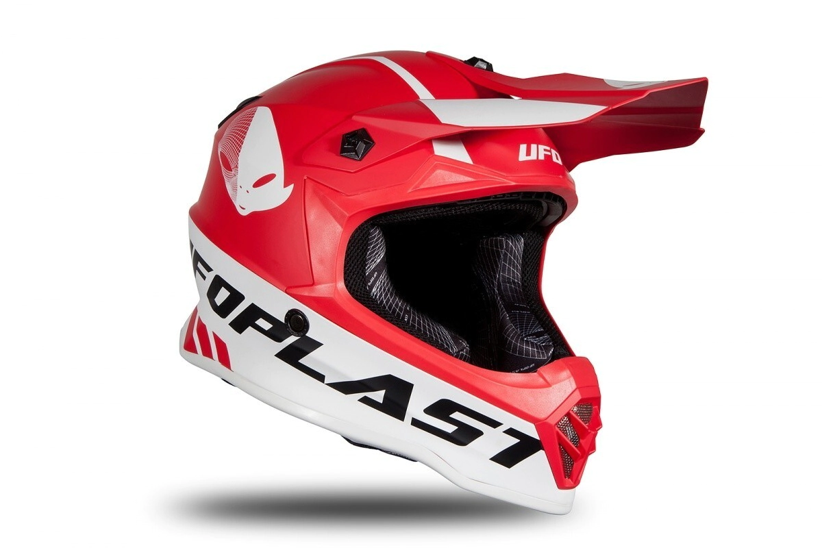 Casco de enduro motocross de dimensiones compactas, fabricado con calota exterior de resina termoplástica de alta resistencia.
