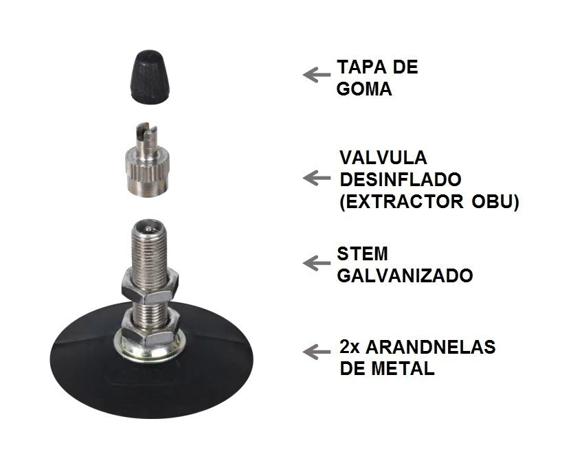 - Construcción de válvula premium (tipo TR4 y TR6) : STEM galvanizado + 2× tuercas de metal + tapón de goma + válvula de desinflado (extractor obu) .