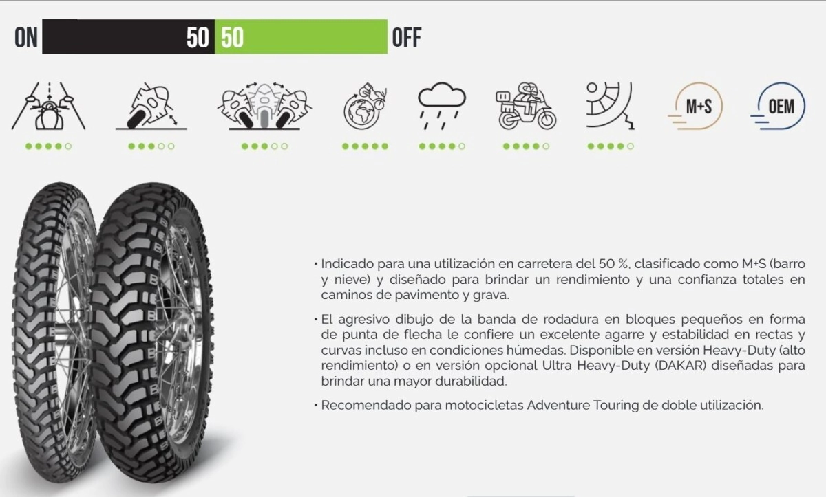 El agresivo dibujo de la banda de rodadura en bloques pequeños en forma de punta de flecha le confiere un excelente agarre y estabilidad en rectas y curvas incluso en condiciones húmedas. Disponible en versión Heavy-Duty (alto rendimiento) o en versión opcional Ultra Heavy-Duty (DAKAR) diseñadas para brindar una mayor durabilidad.