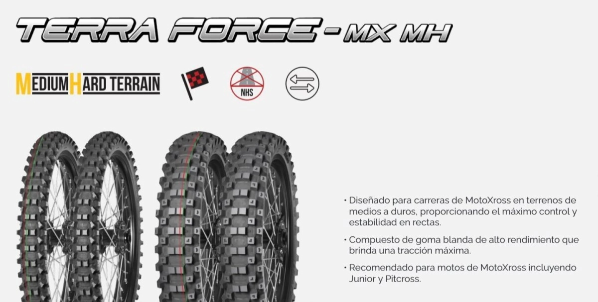 Diseñado para carreras de MotoXross en terrenos de medios a duros, proporcionando el máximo control y estabilidad en rectas.
