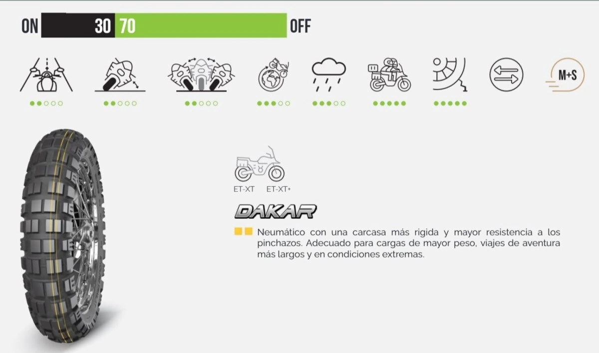Neumático version DAKAR con una carcasa más rigida y mayor resistencia a los pinchazos. Adecuado para cargas de mayor peso, viajes de aventura más largos y en condiciones extremas.