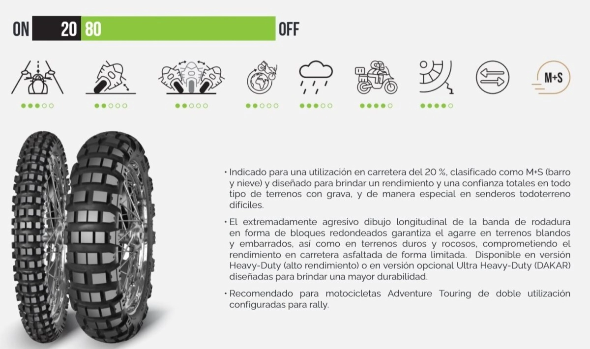 Indicado para una utilización en carretera del 20 %, clasificado como M+S (barro y nieve) y diseñado para brindar un rendimiento y una confianza totales en todo tipo de terrenos con grava, y de manera especial en senderos todoterreno difíciles.