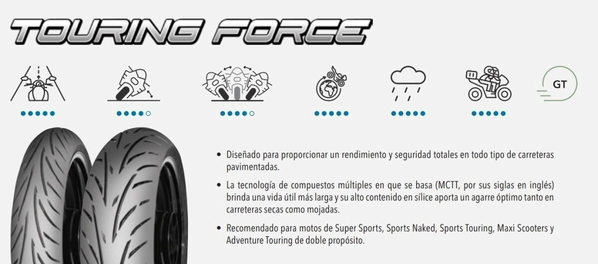 La tecnología de compuestos múltiples en que se basa (MCTT, por sus siglas en inglés) brinda una vida útil más larga y su alto contenido en sílice aporta un agarre óptimo tanto en carreteras secas como mojadas.