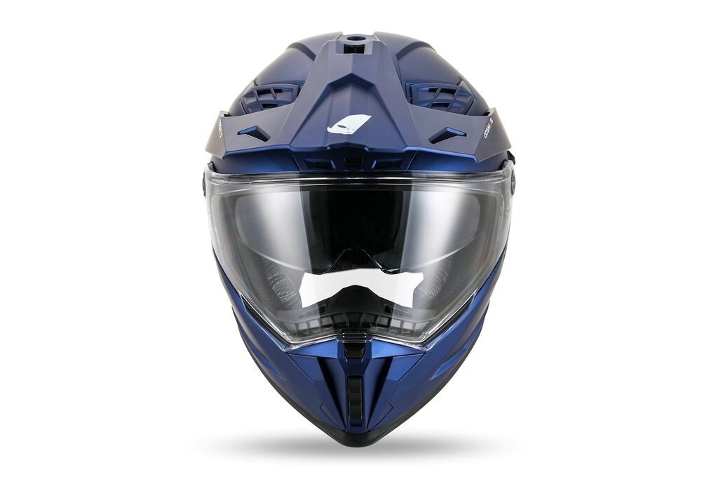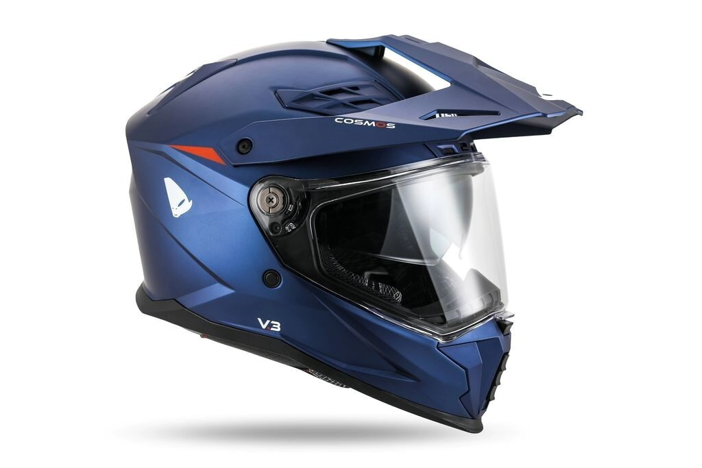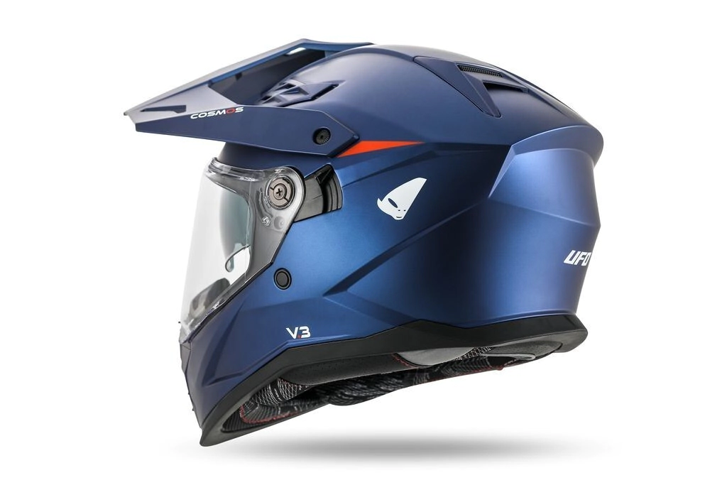 El casco Cosmos Tourer/Crossover de UFO Plast cuenta con una calota exterior de doble capa fabricada con resina termoplástica ultrarresistente y altamente protectora. Equipado con visera transparente de policarbonato resistente a arañazos y visera solar interna de policarbonato ahumado anti-UV retráctil mediante deslizador.