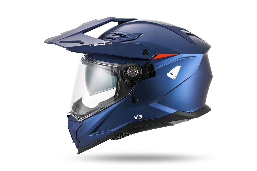 El casco Cosmos Tourer/Crossover de UFO Plast cuenta con una calota exterior de doble capa fabricada con resina termoplástica ultrarresistente y altamente protectora. Equipado con visera transparente de policarbonato resistente a arañazos y visera solar interna de policarbonato ahumado anti-UV retráctil mediante deslizador.