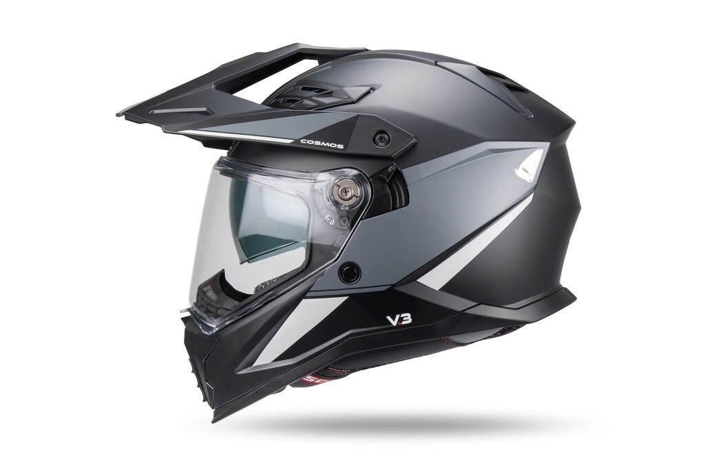 El casco Cosmos Tourer/Crossover de UFO Plast cuenta con una calota exterior de doble capa fabricada con resina termoplástica ultrarresistente y altamente protectora. Equipado con visera transparente de policarbonato resistente a arañazos y visera solar interna de policarbonato ahumado anti-UV retráctil mediante deslizador.