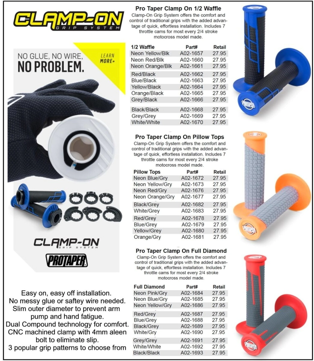 Utilizando lo último en tecnología de agarre y técnicas de moldeo, el sistema de agarre Clamp-On de ProTaper ofrece la comodidad y el control de los agarres tradicionales con la ventaja adicional de una instalación rápida y sin esfuerzo. El diseño elimina la necesidad de pegamento y alambre de seguridad, pero garantiza un rendimiento duradero y antideslizante.