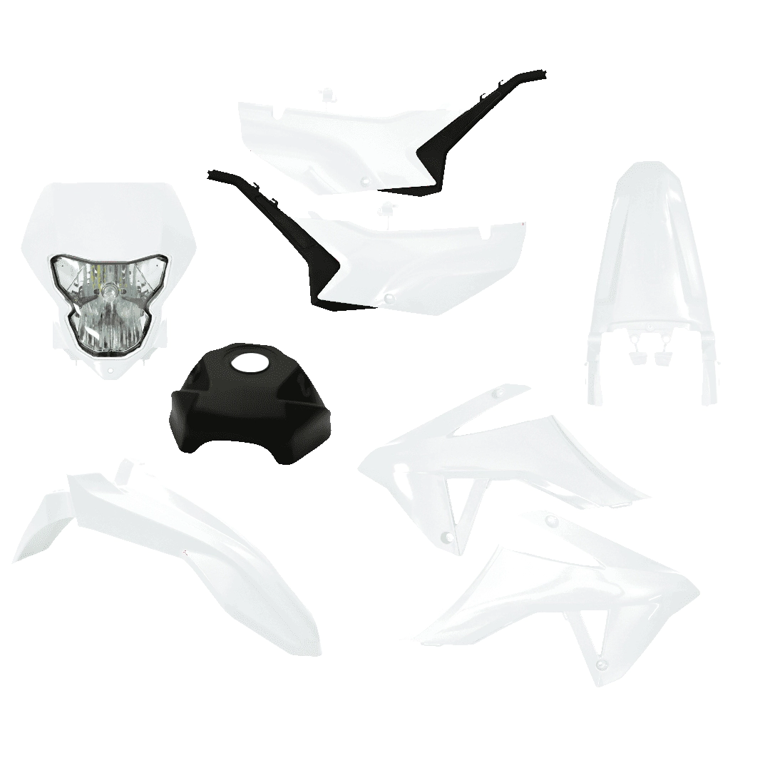 INCLUYE PROTECCION DE TANQUE, GUARDABARROS DELANTERO, TRASERO, CACHAS LATERALES, PORTA FARO CON OPTICA Y CALCOMANIAS