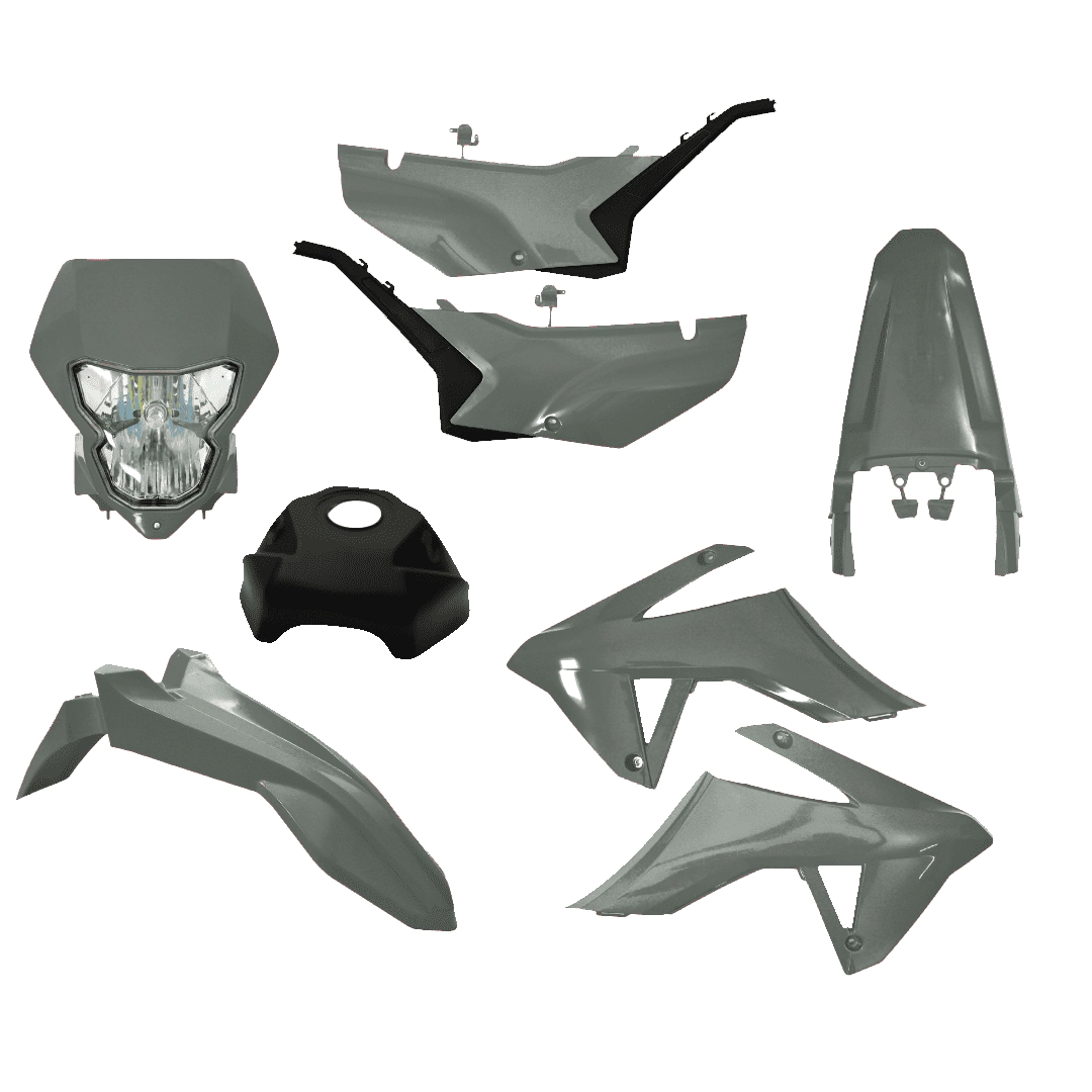 INCLUYE PROTECCION DE TANQUE, GUARDABARROS DELANTERO, TRASERO, CACHAS LATERALES, PORTA FARO CON OPTICA Y CALCOMANIAS