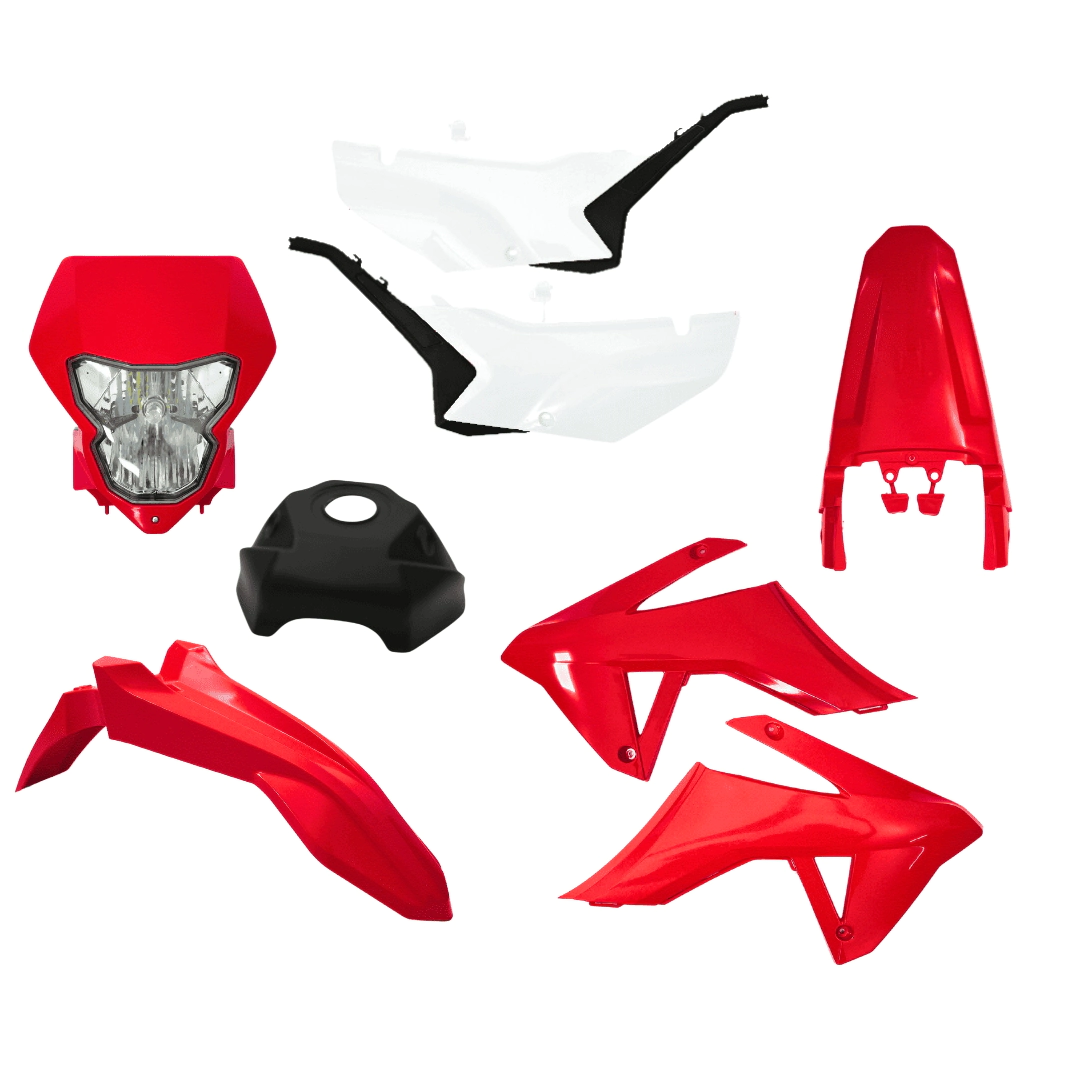 INCLUYE PROTECCION DE TANQUE, GUARDABARROS DELANTERO, TRASERO, CACHAS LATERALES, PORTA FARO CON OPTICA Y CALCOMANIAS